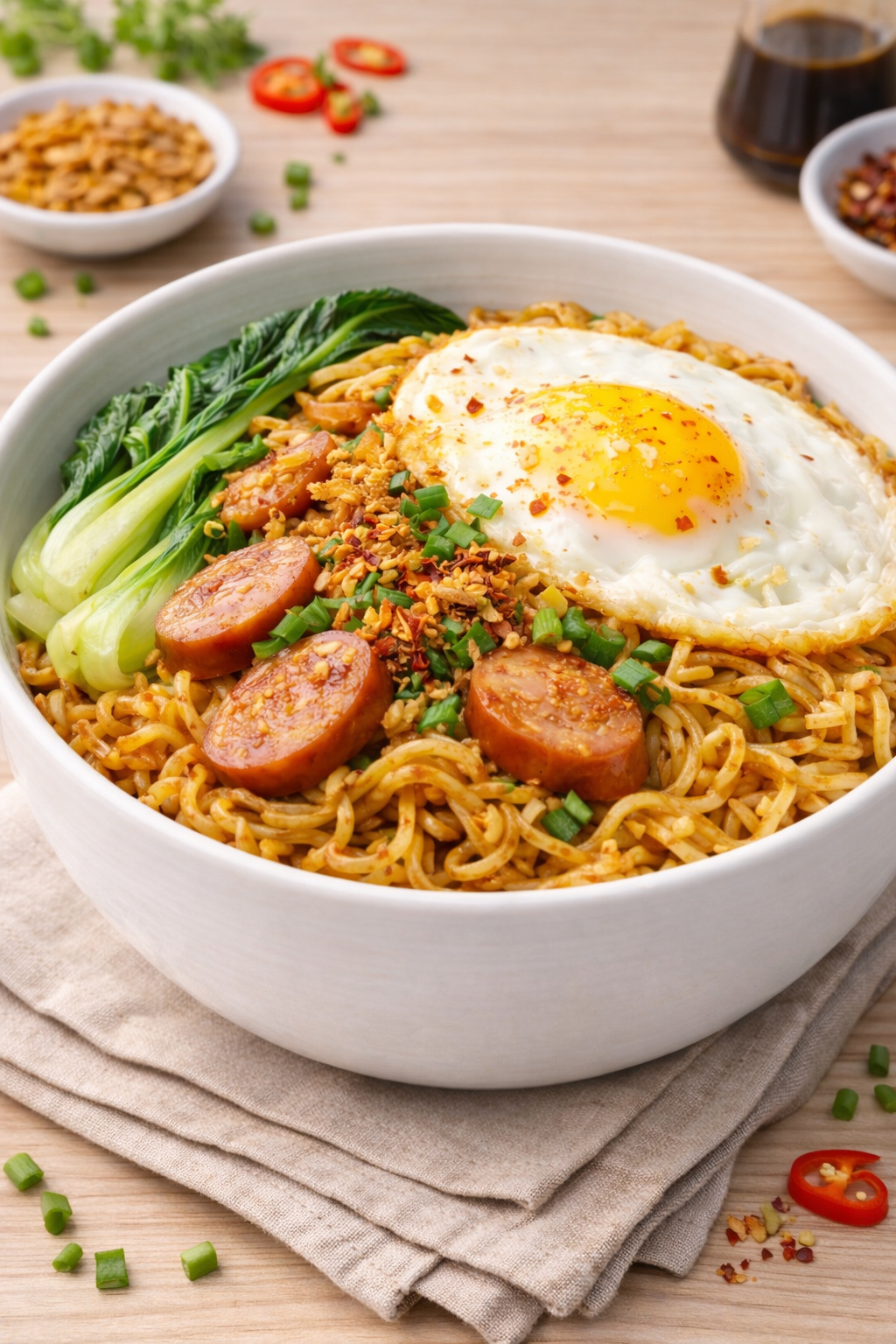 - Top the noodles with sausage, fried egg, bok choy, and fried shallots.